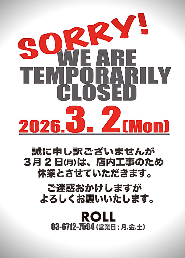 誠に勝手ながら、3月2日(月)は店内工事のため定休日とさせて頂きます。